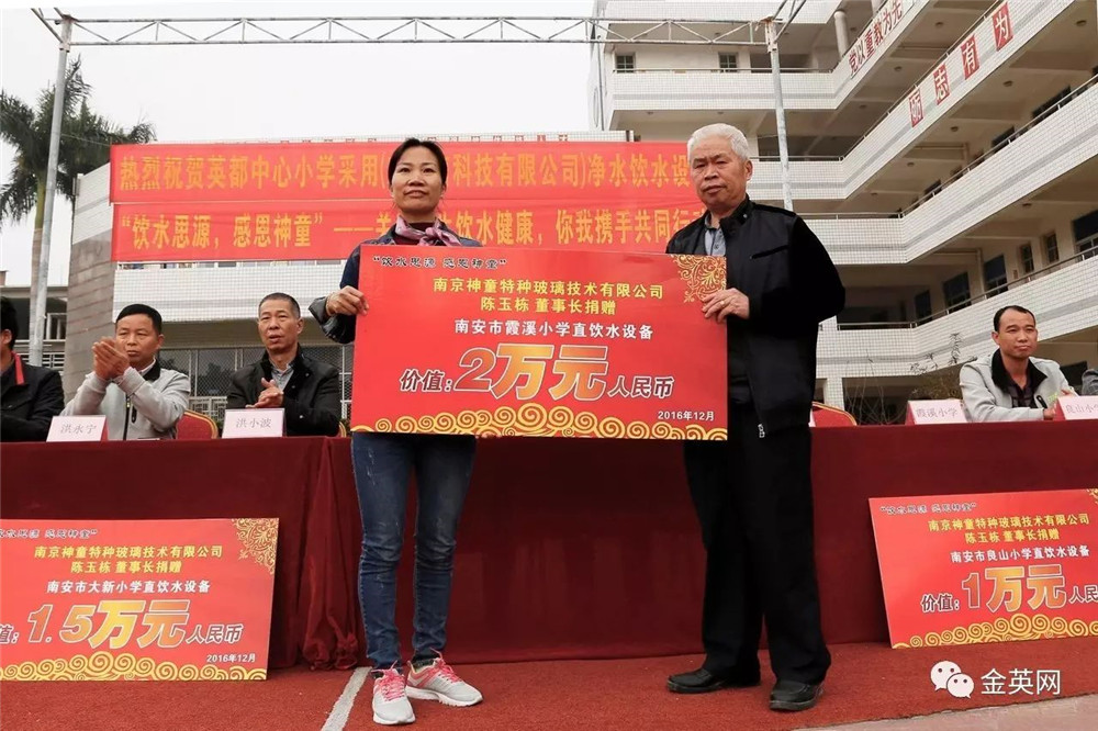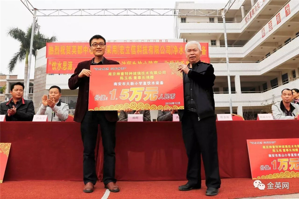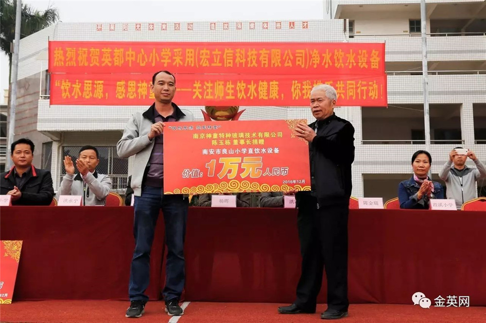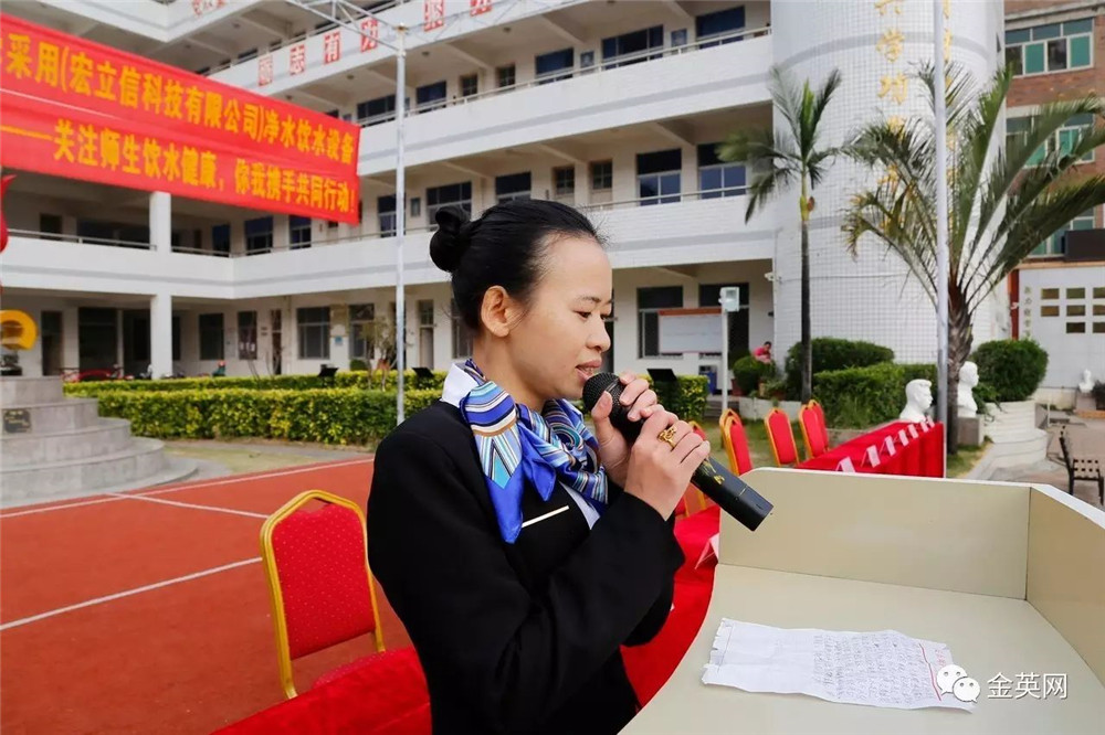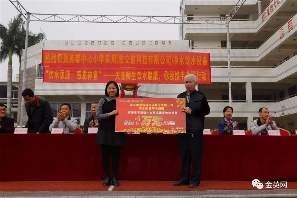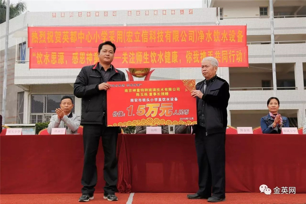 2016年10月,英都鎮(zhèn)中心小學(xué)書(shū)記洪新江老師參觀了其他高等級(jí)學(xué)校的飲水設(shè)備后心心念念想給全鎮(zhèn)的各所小學(xué)配上高性能飲水機(jī),但受限于學(xué)校沒(méi)有財(cái)力支持,每次都只能望而興嘆!魯米星董事長(zhǎng)陳玉棟先生獲悉情況后,通過(guò)調(diào)查得知廣東宏立信凈水器在泉州有良好的市場(chǎng)口碑和信譽(yù),溝通后立刻委派南安市廣東宏立信凈水器總經(jīng)銷(xiāo)商銷(xiāo)售經(jīng)理陳麗萍女士到學(xué)校了解情況,隨后陳總果斷拿出10萬(wàn)元給全鎮(zhèn)7所完全小學(xué)配上高性能飲水機(jī),從根本上解決了小學(xué)生亂買(mǎi)飲料亂喝飲料的重大問(wèn)題!校園飲水衛(wèi)生問(wèn)題也引起了南安市人大主席的重視,指示各學(xué)校要想辦法落實(shí)中小學(xué)生飲水衛(wèi)生工程。