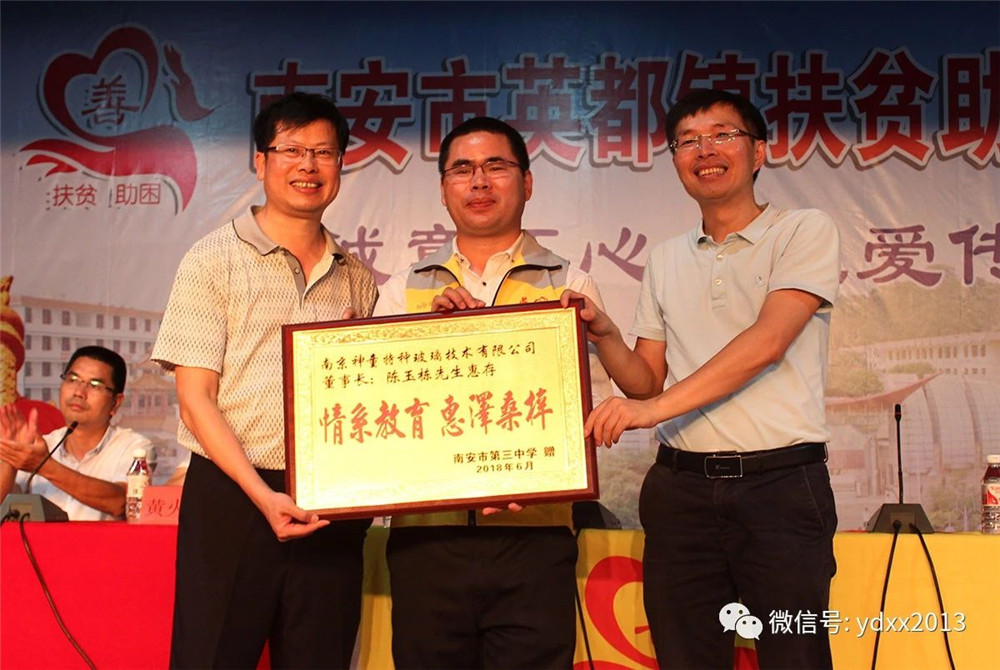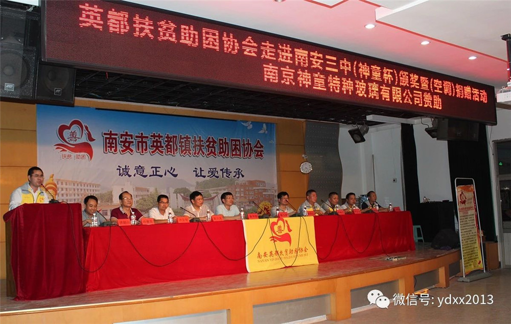 英都鎮(zhèn)扶貧助困協(xié)會會長洪梅生首先致詞,他說,今天的頒獎儀式是協(xié)會常務(wù)副會長、南京神童特種玻璃技術(shù)有限公司董事長陳玉棟慷慨捐資獨家贊助南安三中初中部和英都中學五年計劃“神童獎杯和獎學金”。他向首批獲得神童獎杯和獎學金的南安三中15位同學表示祝賀。